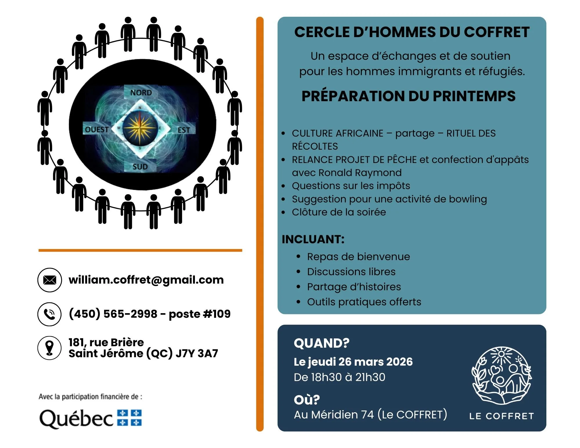 Le but premier du Cercle d’Hommes est de créer un espace d’expression pour les hommes, leur donnant la possibilité de s’exprimer librement sur leur vécu ainsi que sur les thèmes qui les préoccupent: travail, relations de couple, de famille, paternité, virilité, violence, sexualité, identité masculine, éducation, conflits, expression de sentiments, santé, projets, créativité et sens de l’existence.